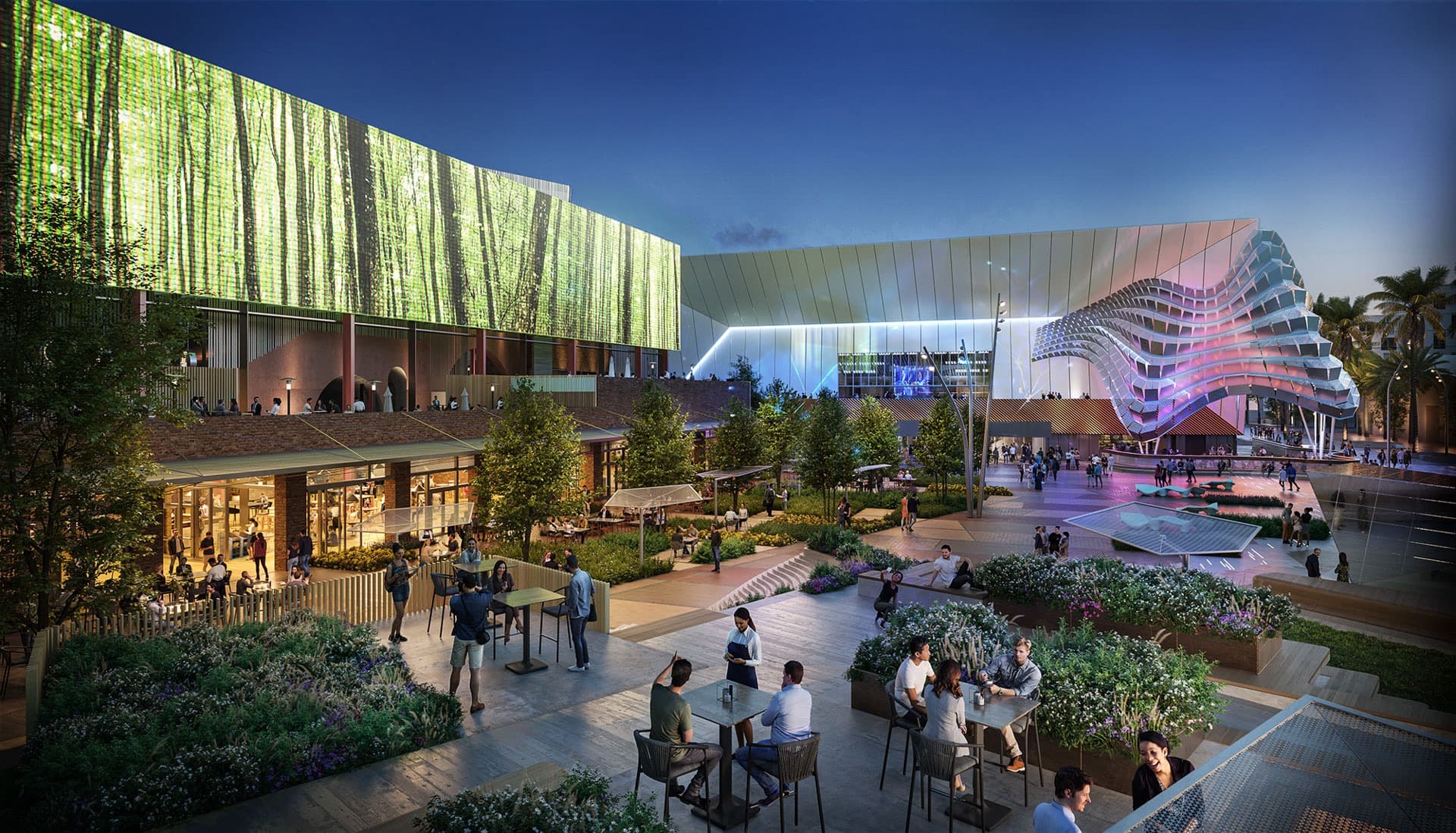 A media screen located within the Urban Park measuring 36-feet-high by 126-feet-wide featuring a 8-millimeter pixel spacing